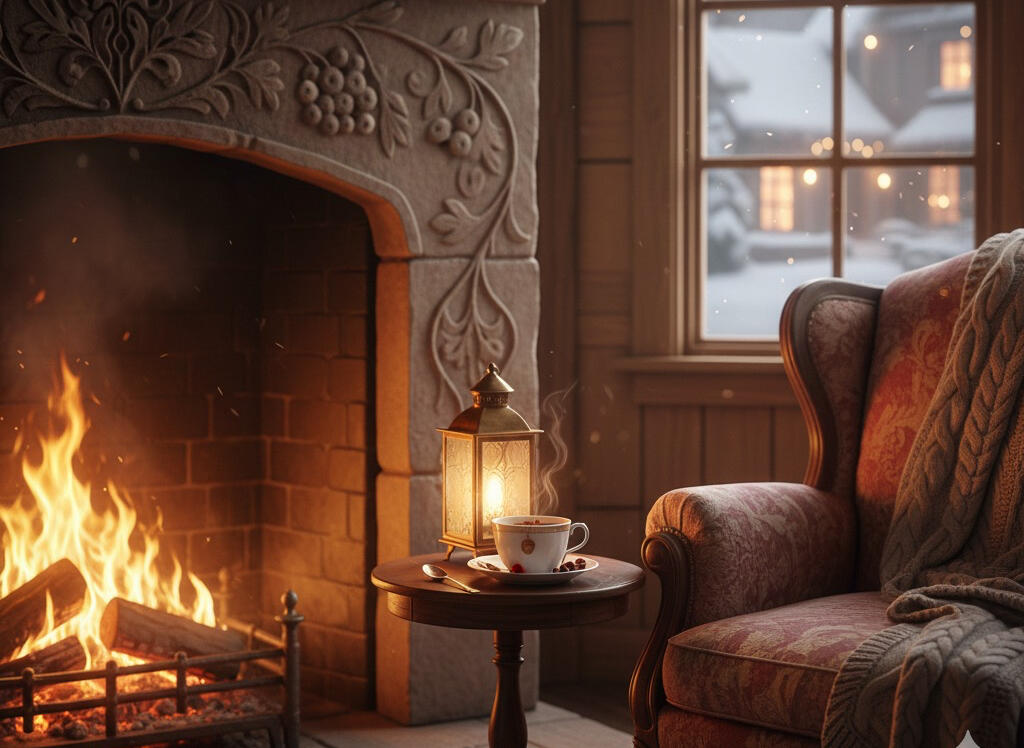 cosy armchair by the warmth of the fire.